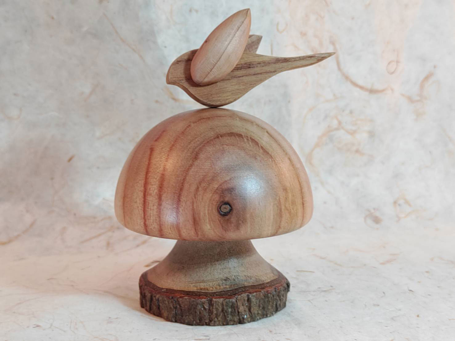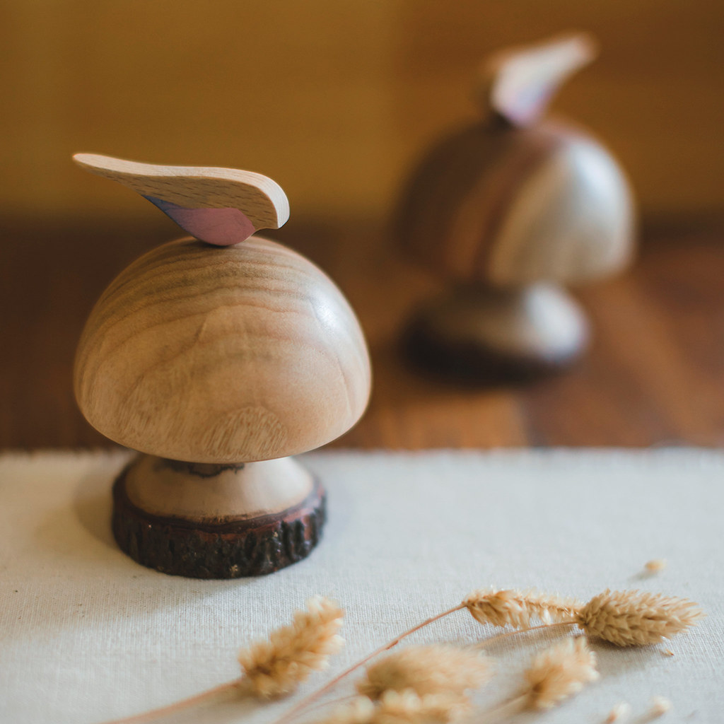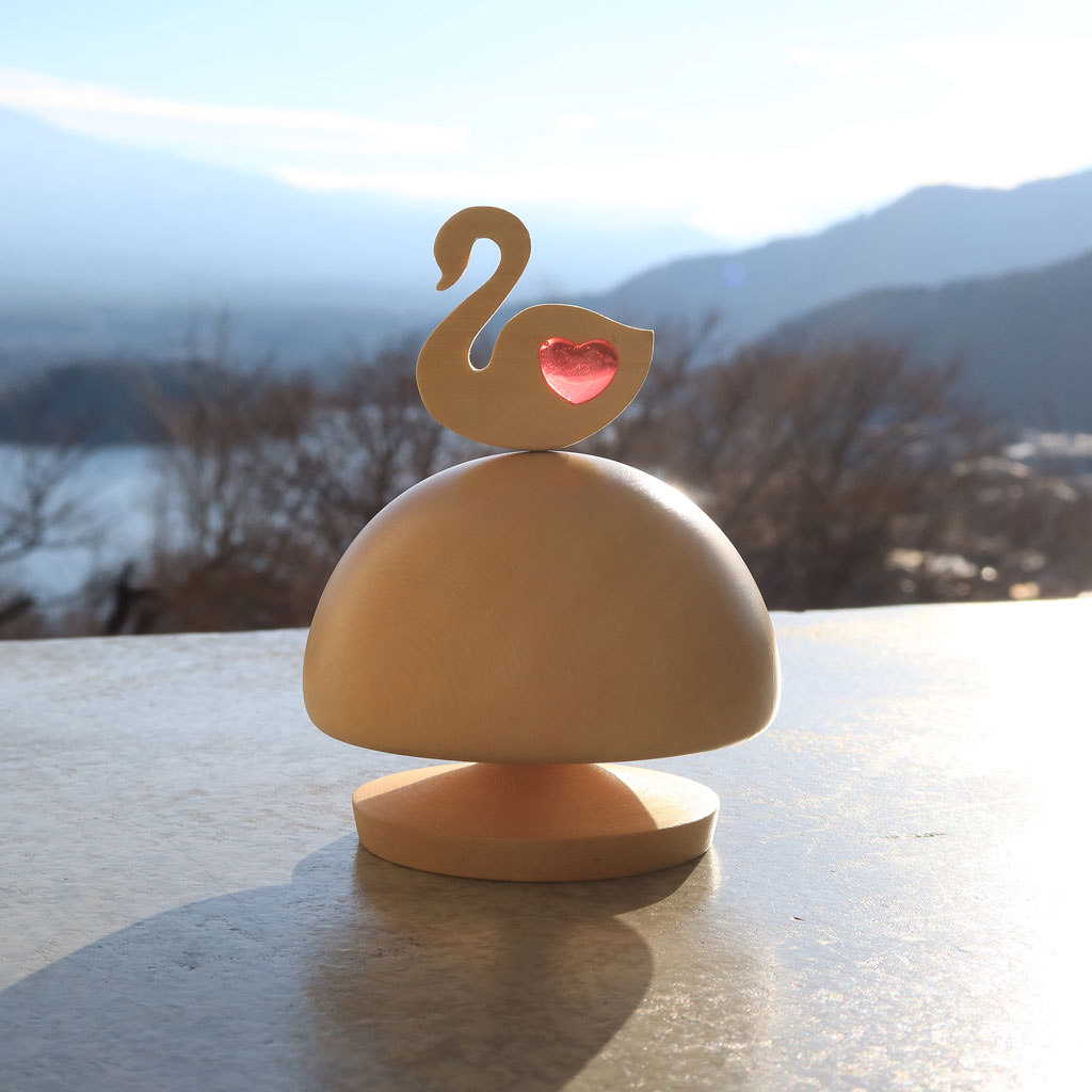 此款音樂鈴屬於愛情主題系列,為傳達純潔無瑕的意象,特地選用無節疤與無藍斑的加拿大檜木製作。外型採飽滿半圓設計,並透過曲面造型與細緻加工,讓每一件作品皆呈現獨特的木材紋理與質感。